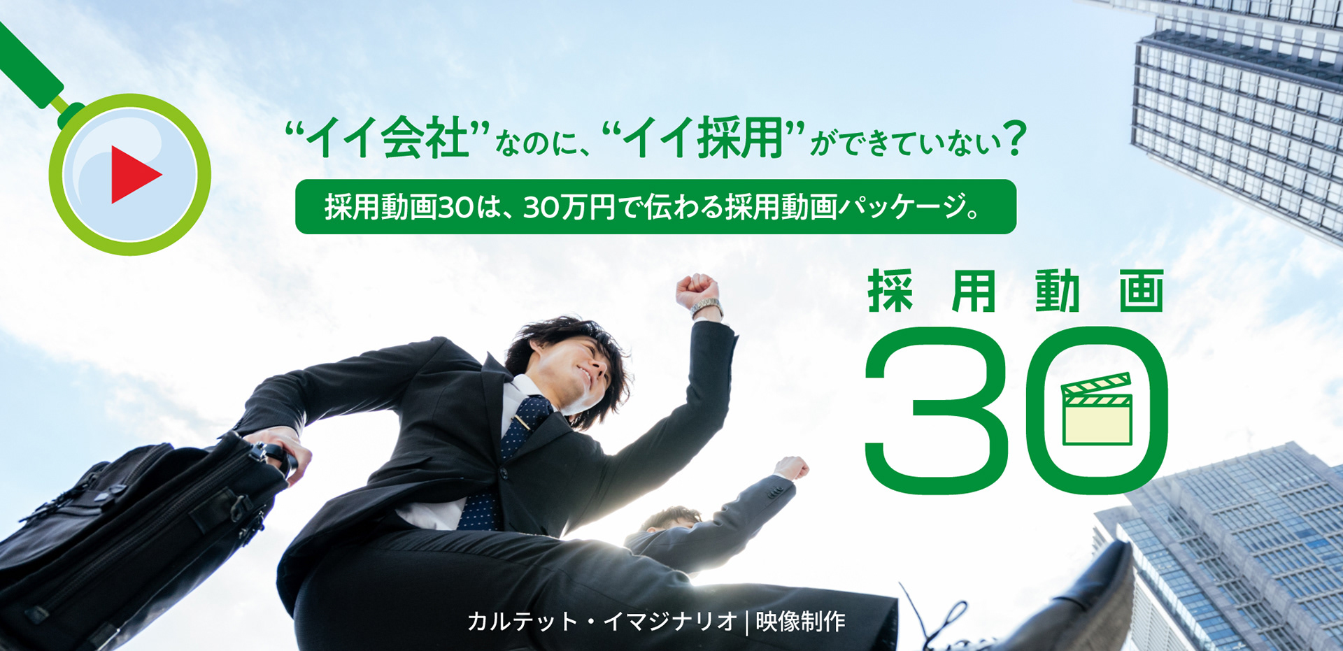 採用動画30は、30万円(税別)で構成台本/撮影/編集をワンパッケージにした、採用動画特化型の制作プランです。新卒・中途を問わず、“低予算でも伝わる”採用動画を短期間で導入できます。