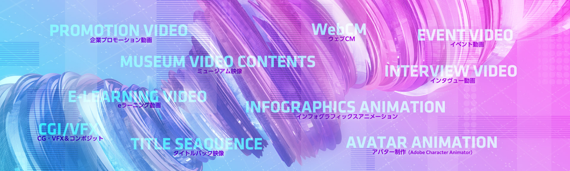 After Effectsによるモーショングラフィックスやインフォグラフィックアニメ、Premiere Proによる編集、DaVinci Resolveによるグレーディング、CGについては、自社CGディレクションと協力スタッフのコーディネーションにより、動画向けCGに特化して様々対応しています。